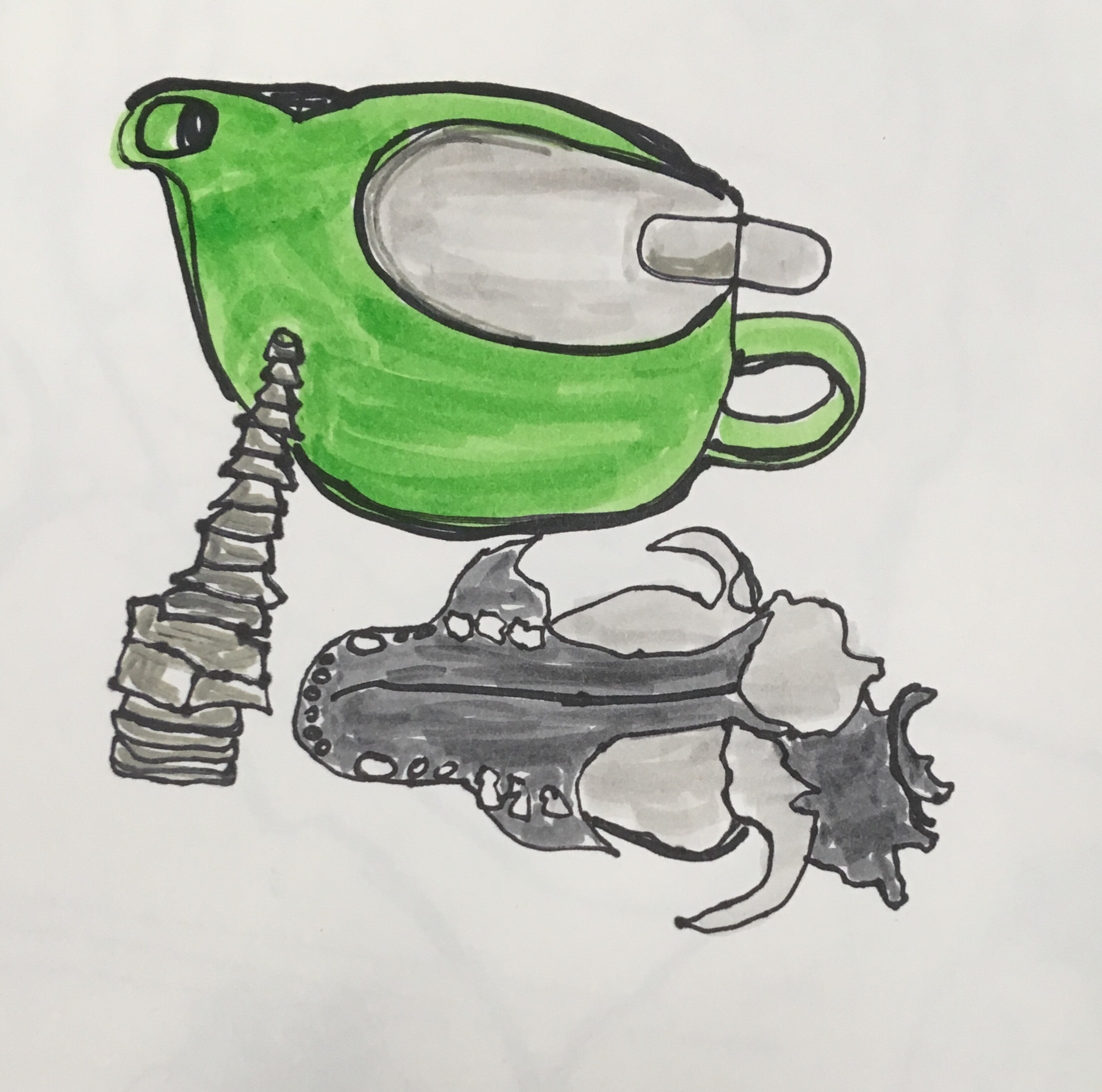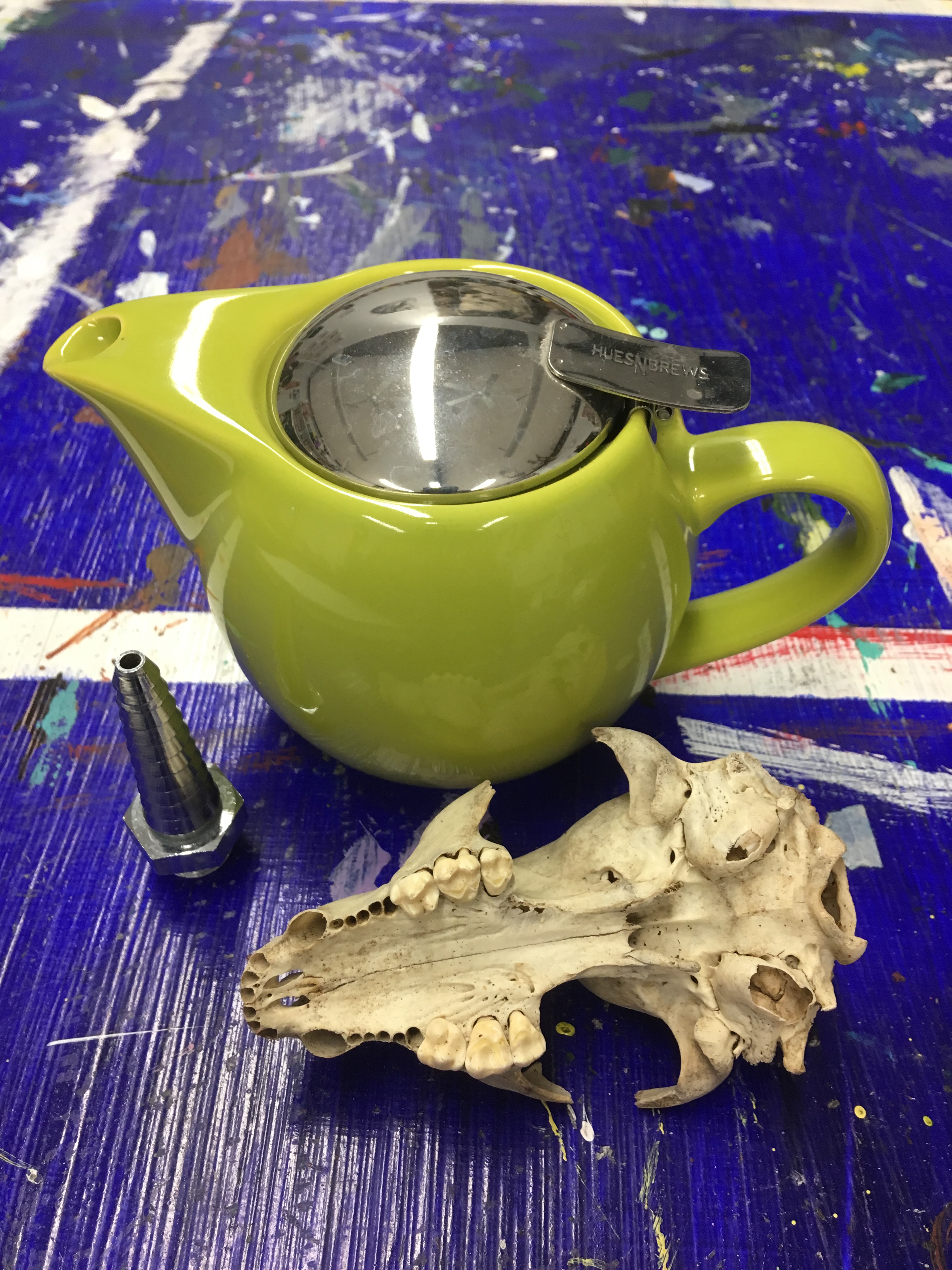 A metal nozzle, skull bone and teapot make an interesting still life. They are found things in the 8th grade art room.