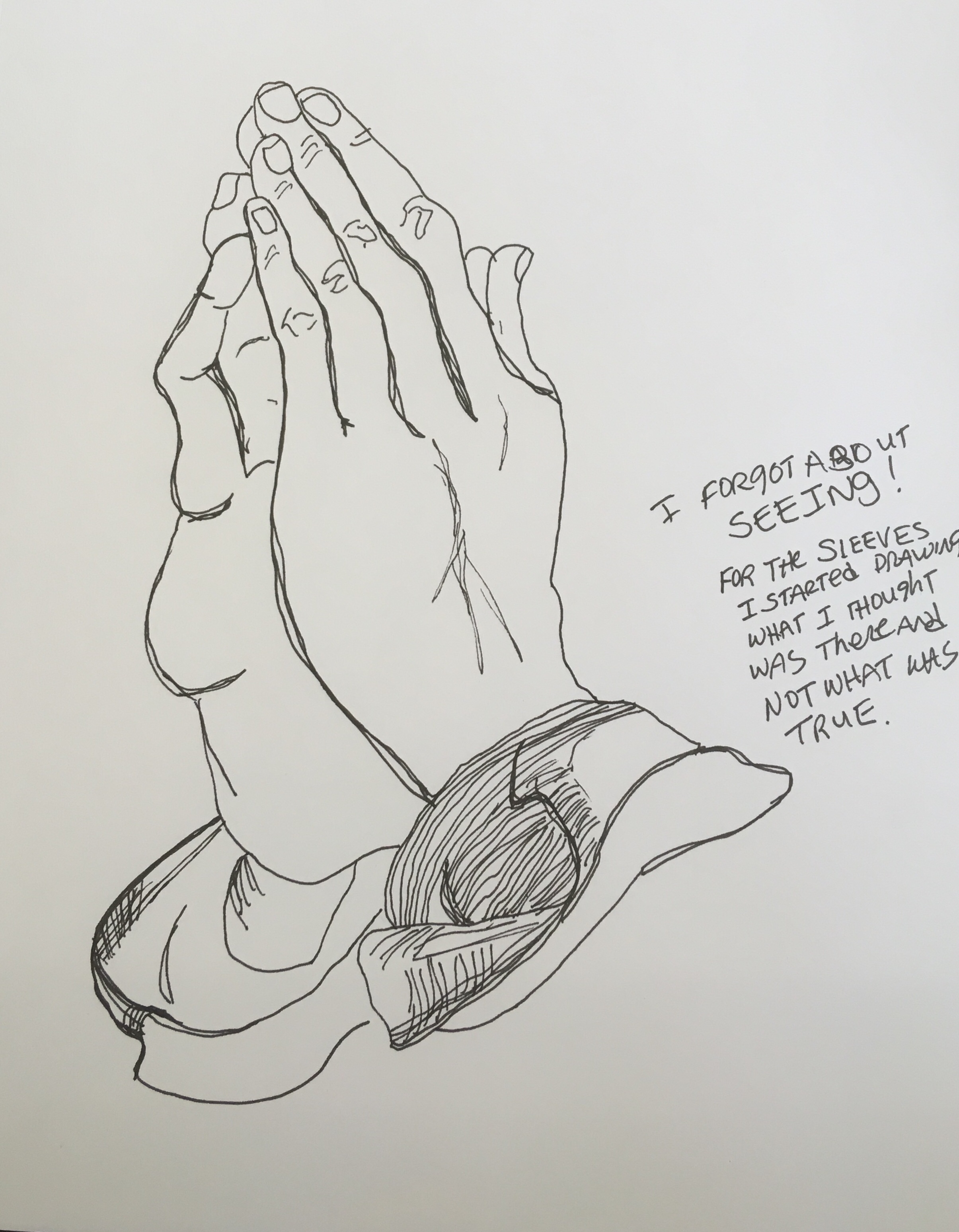 Albrecht Dürer Praying Hands (Study of the Hands of an Apostle) c. 1508, ink drawing with white heightening on (self-made) blue colored paper, 29.1 cm × 19.7 cm (11.5 in × 7.8 in)An assortment of shades of blue wax crayons for the background and inktense pencil in a 9 in by 12 in series 400 strathmore sketchbook . HAND 90 of 100Technical pen in a 9 in by 12 in series 400 strathmore sketchbook HAND 91 of 100