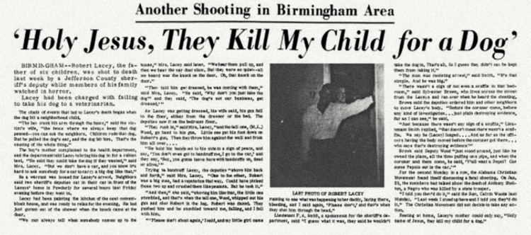 January 27, 1967 ~ Jefferson County sheriff deputies went to the home of Robert Lacey, a Black father of six, to enforce a law requiring him to take the family dog to the veterinarian. The police engaged in a confrontation with Mr. Lacey and shot him to death.