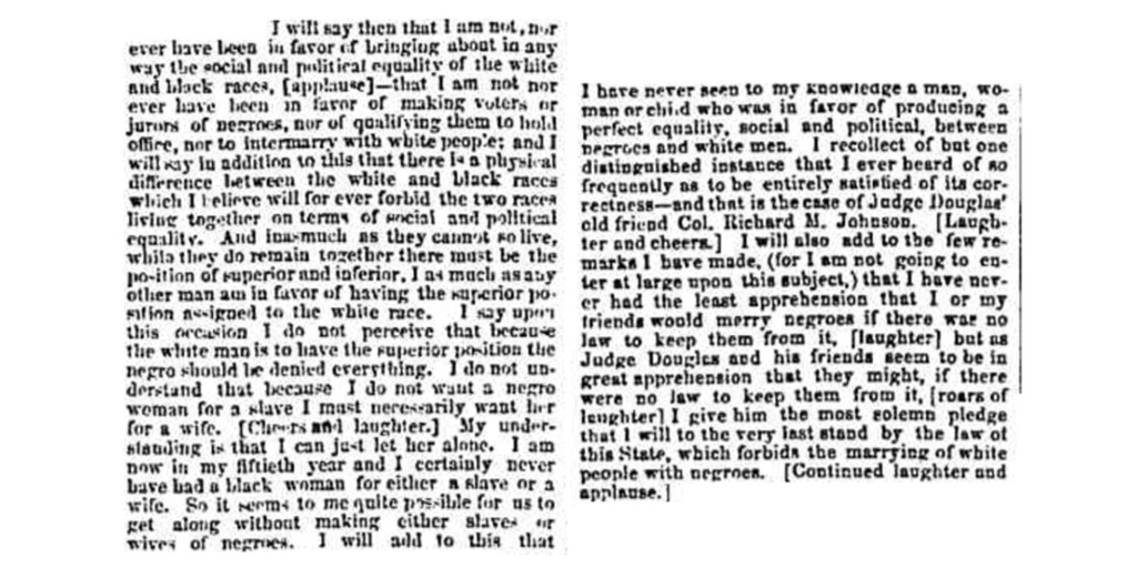 “I am not, nor ever have been, in favor of bringing about in any way the social and political equality of the white and black races … I am not nor ever have been in favor of making voters or jurors of Negroes, nor of qualifying them to hold office, nor to intermarry with white people; and I will say in addition to this that there is a physical difference between the white and black races which I believe will forever forbid the two races from living together on terms of social and political equality. And inasmuch as they cannot so live, while they do remain together there must be a position of superior and inferior, and I as much as any other man am in favor of having the superior position assigned to the white race.”