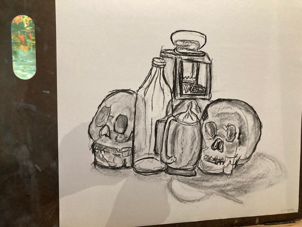 Drawing with Mr. Nisbet Posted byrtsallieOctober 18, 2022Posted inDaily Art, Still LifeTags:charcoal I am learning to use charcoal. Mr. Nisbet is teaching me. Mr. Nisbet set up a still life for us to draw together during a lunch period. Mr. Nisbet’s drawing is on the left. My attempt. Related
