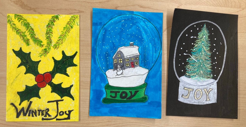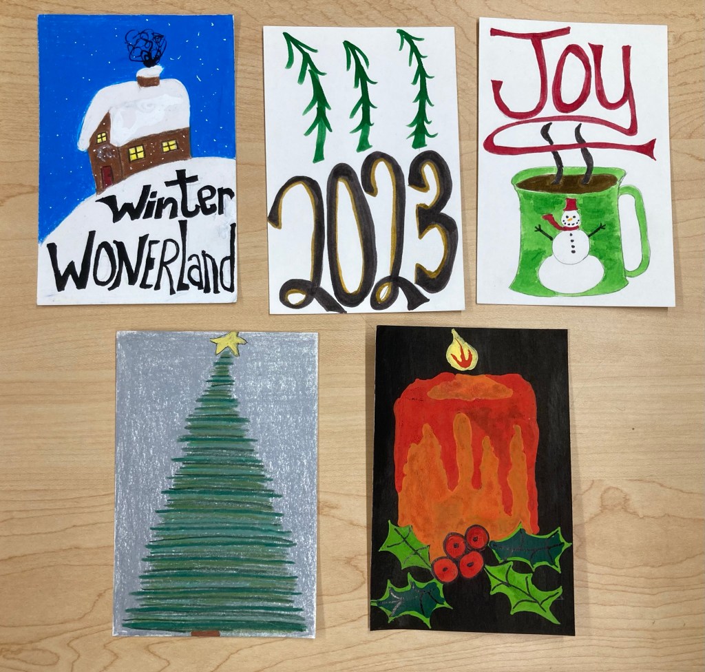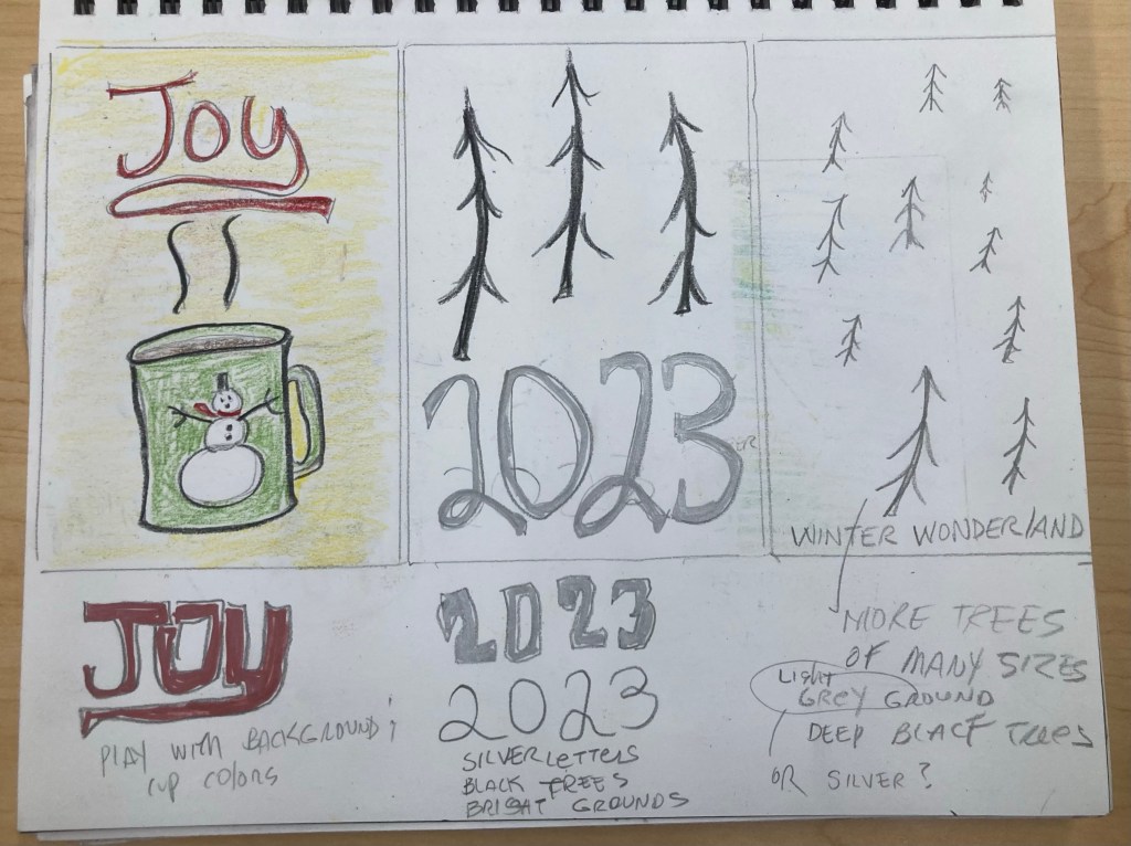 I love making postcards, artist training cards and notecards. I designed and made several this holiday season. This year spent a couple of weeks playing with designs in my sketchbook. One of my 2023 goals is the get back into that practice.