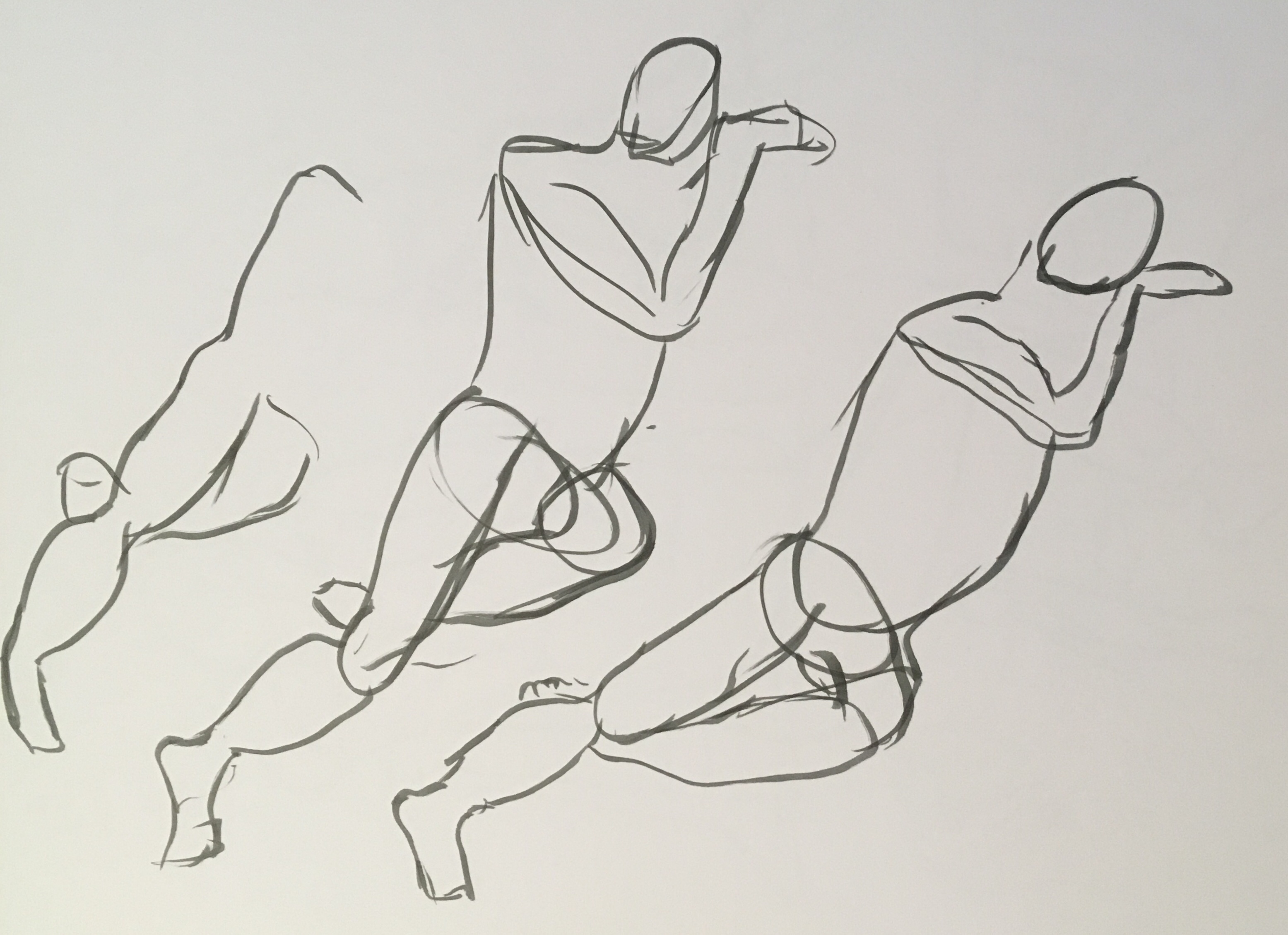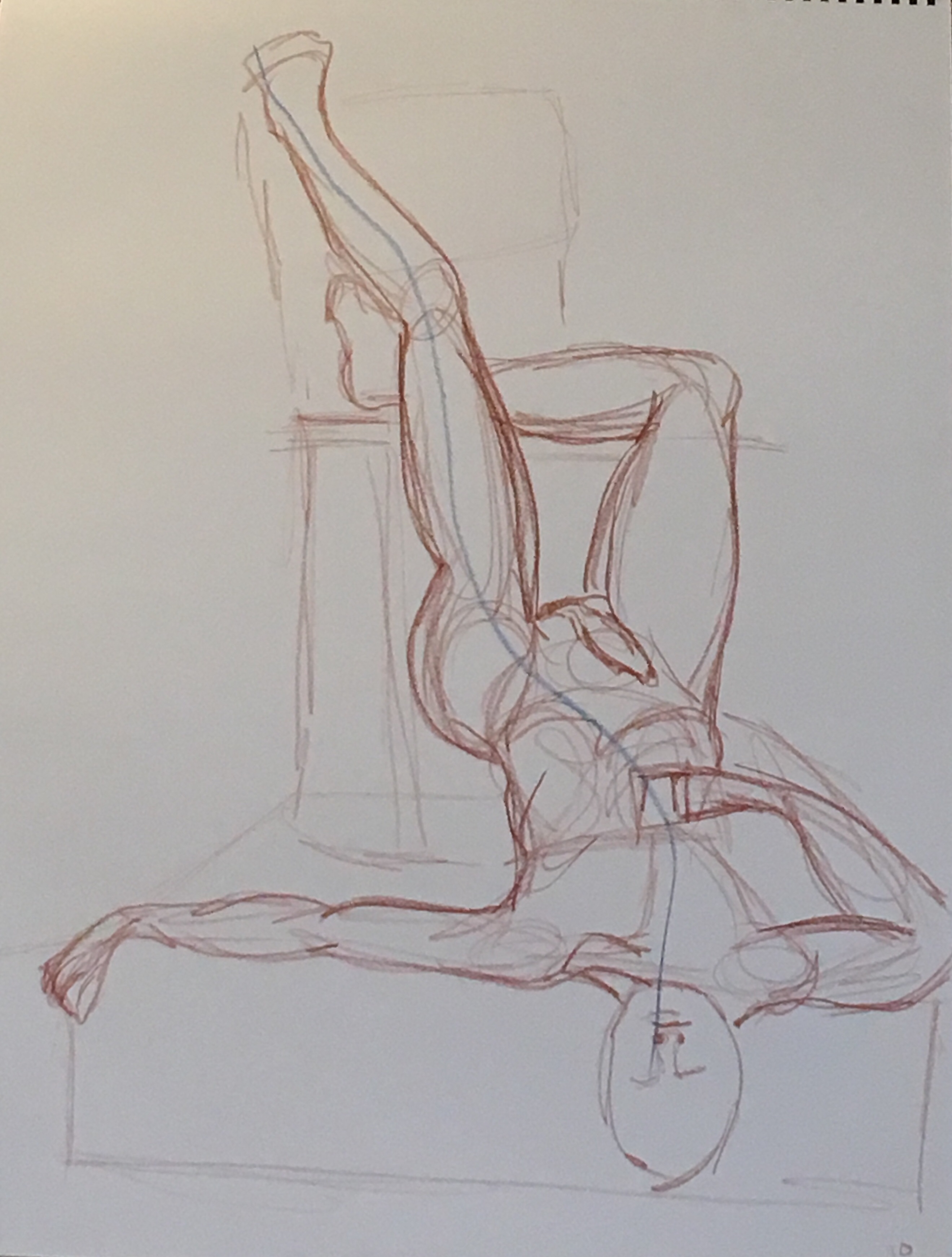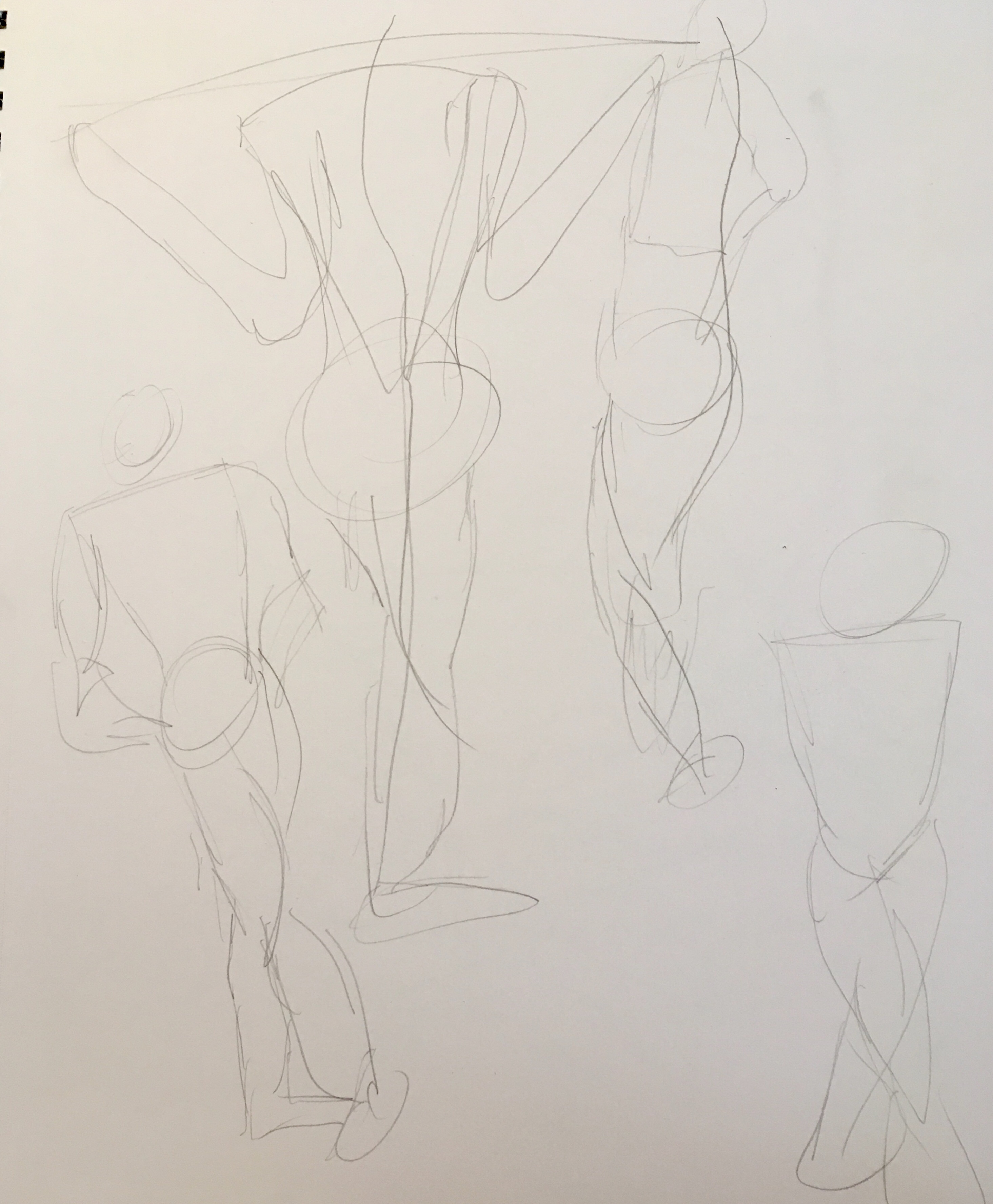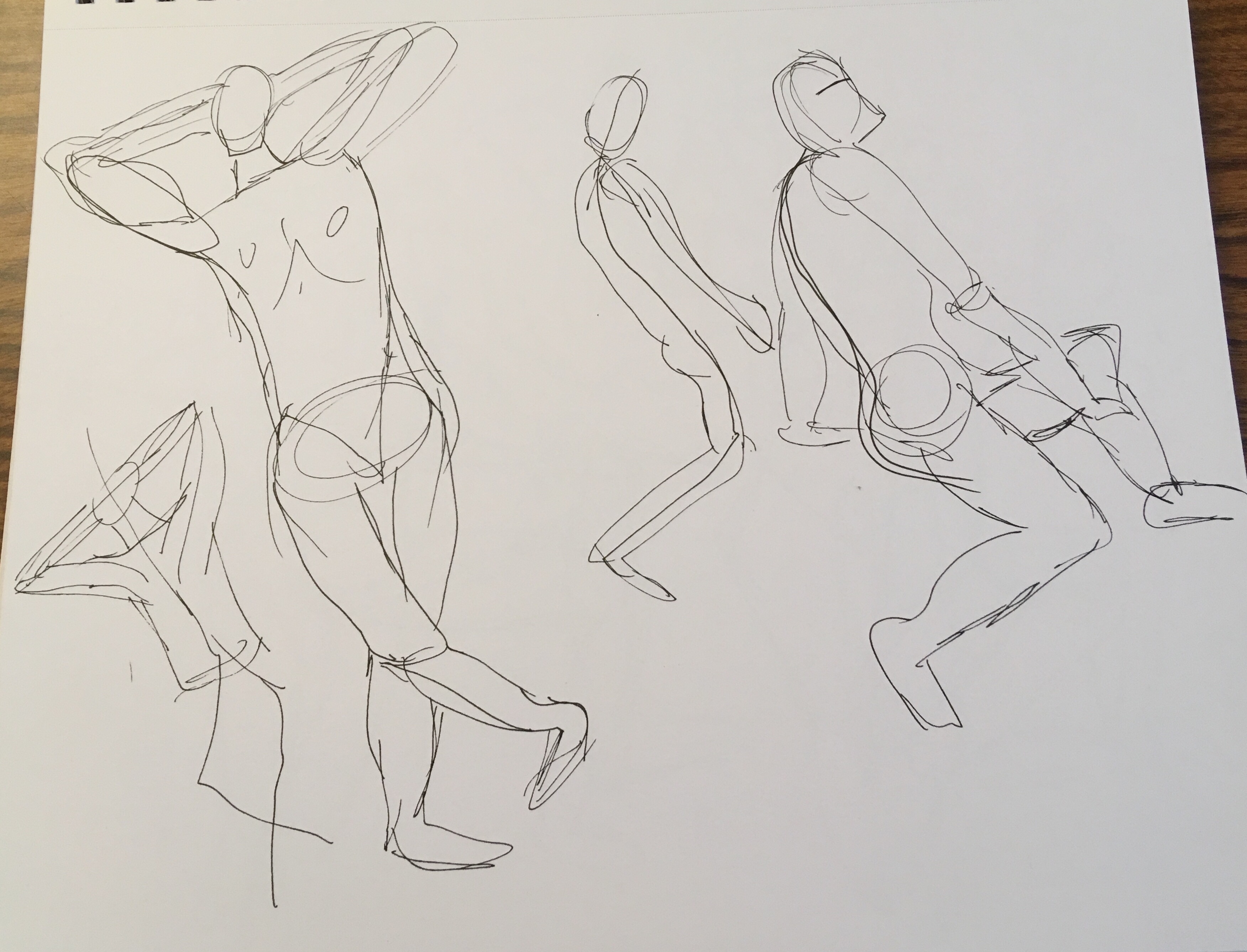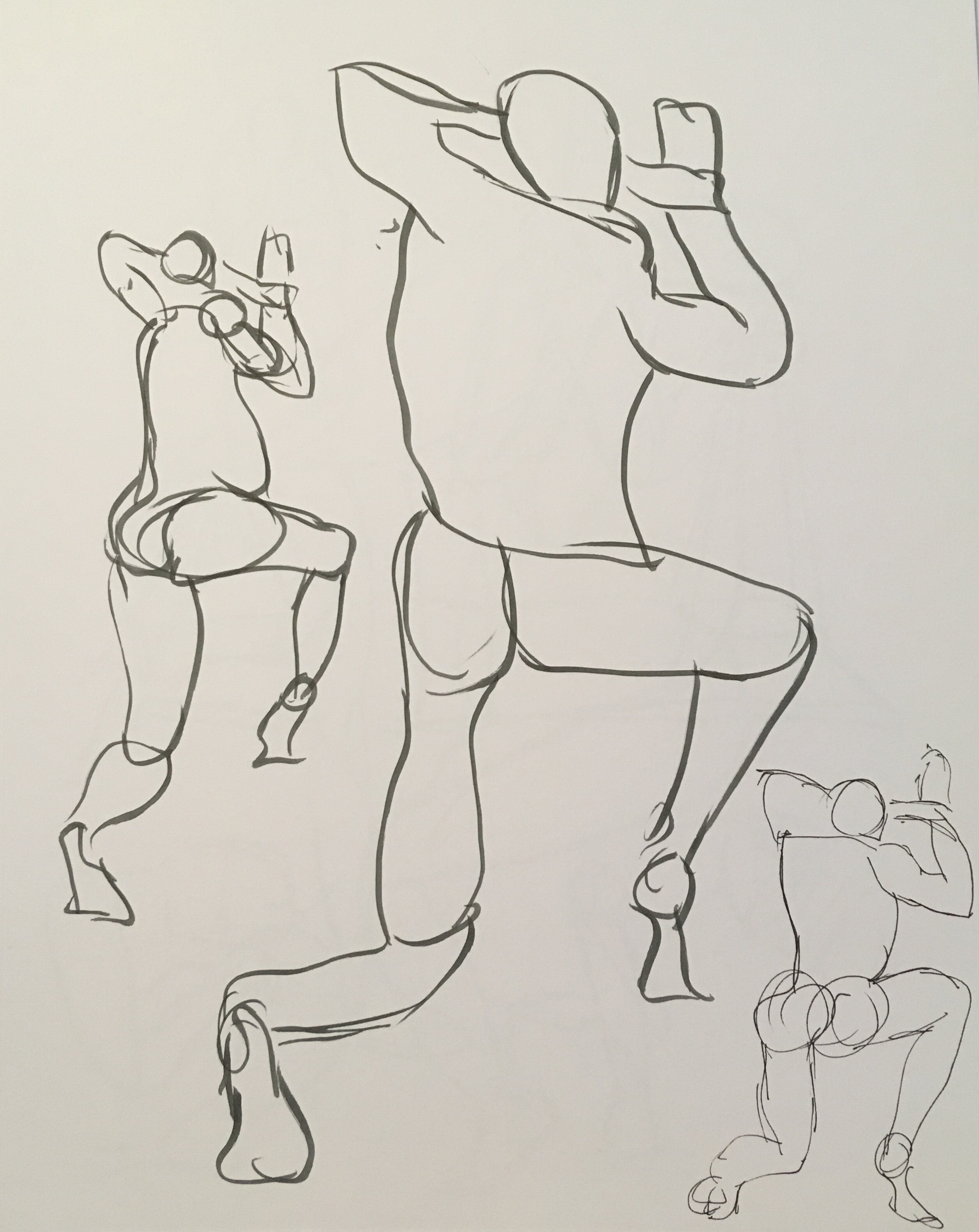 She notice that I am focusing a lot on contour, and not on the overall volume and movement of the figure. She told me that true gesture drawing captures the movement, or “story” of the pose. She showed me that I can convey what the figure is doing with just a couple lines, instead of drawing the outline/contour.