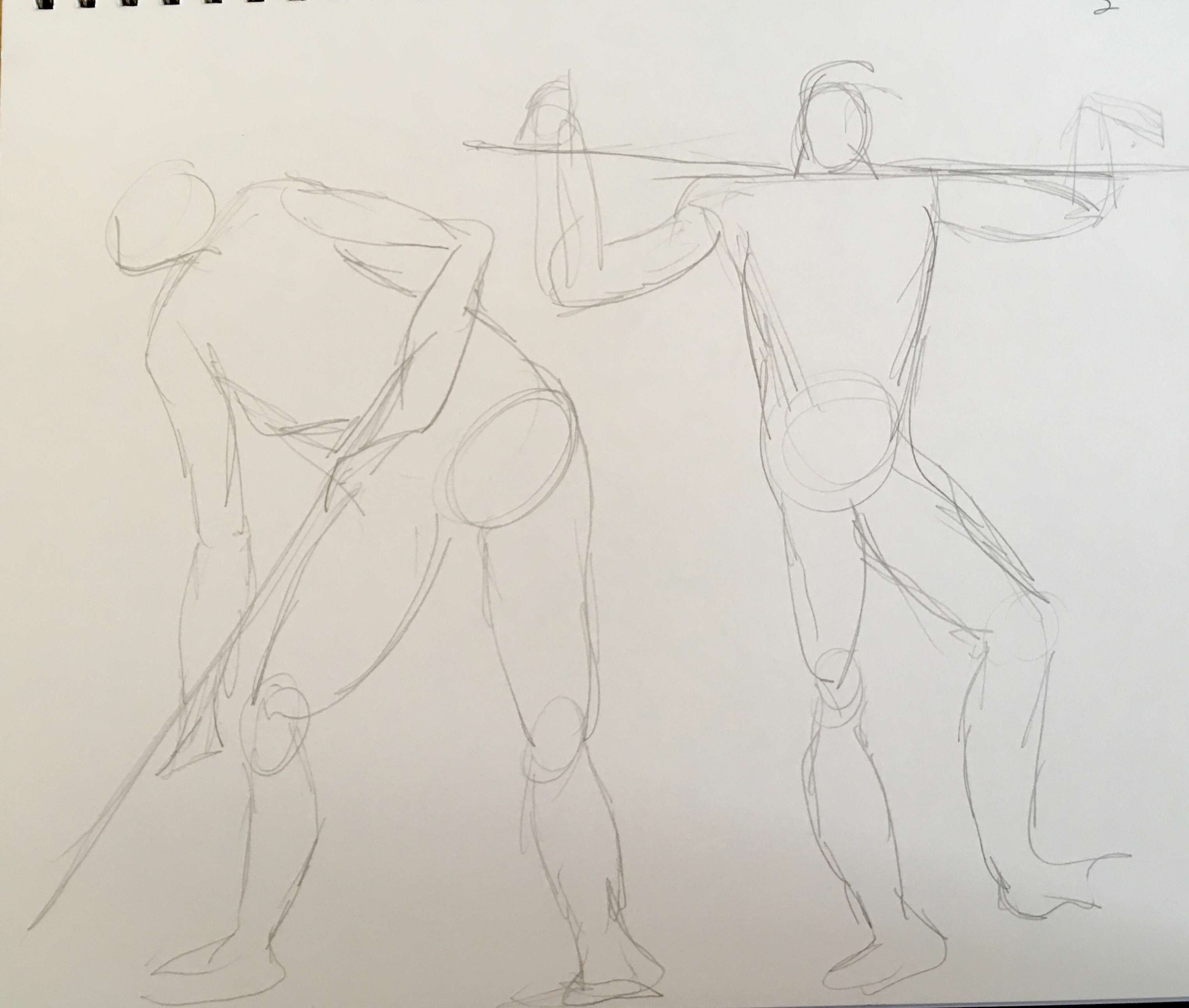 My Mentor suggests that I really push the angles to exaggerate the pose. The two standing figures probably have a sway in their back, starting at the head and doing an s-curve to the pelvis. She drew a quick example over the figure on the lower left to show how I can push and exaggerate, but still capture the pose. She suggested that exaggeration and movement will help my figures look less stiff.