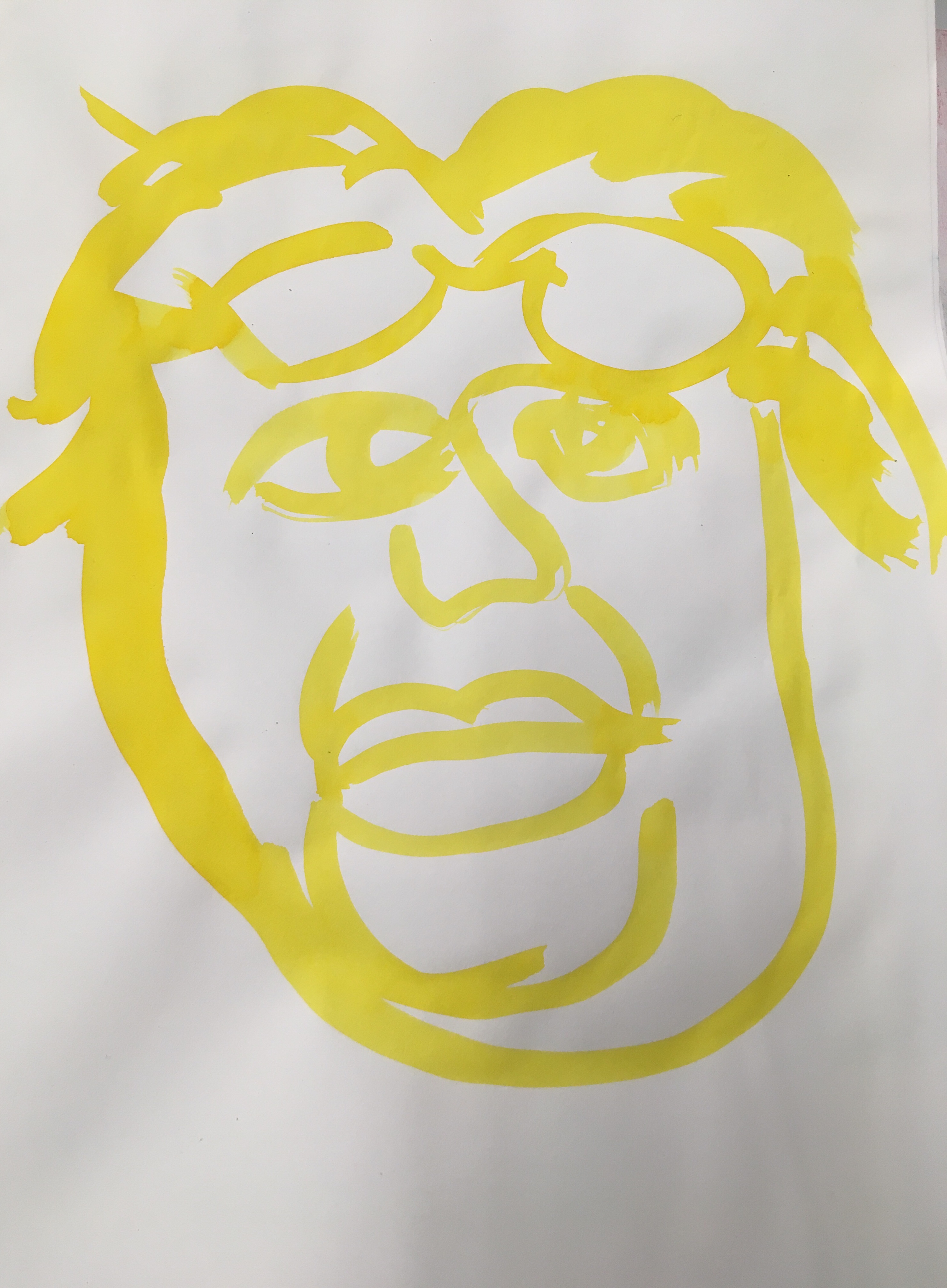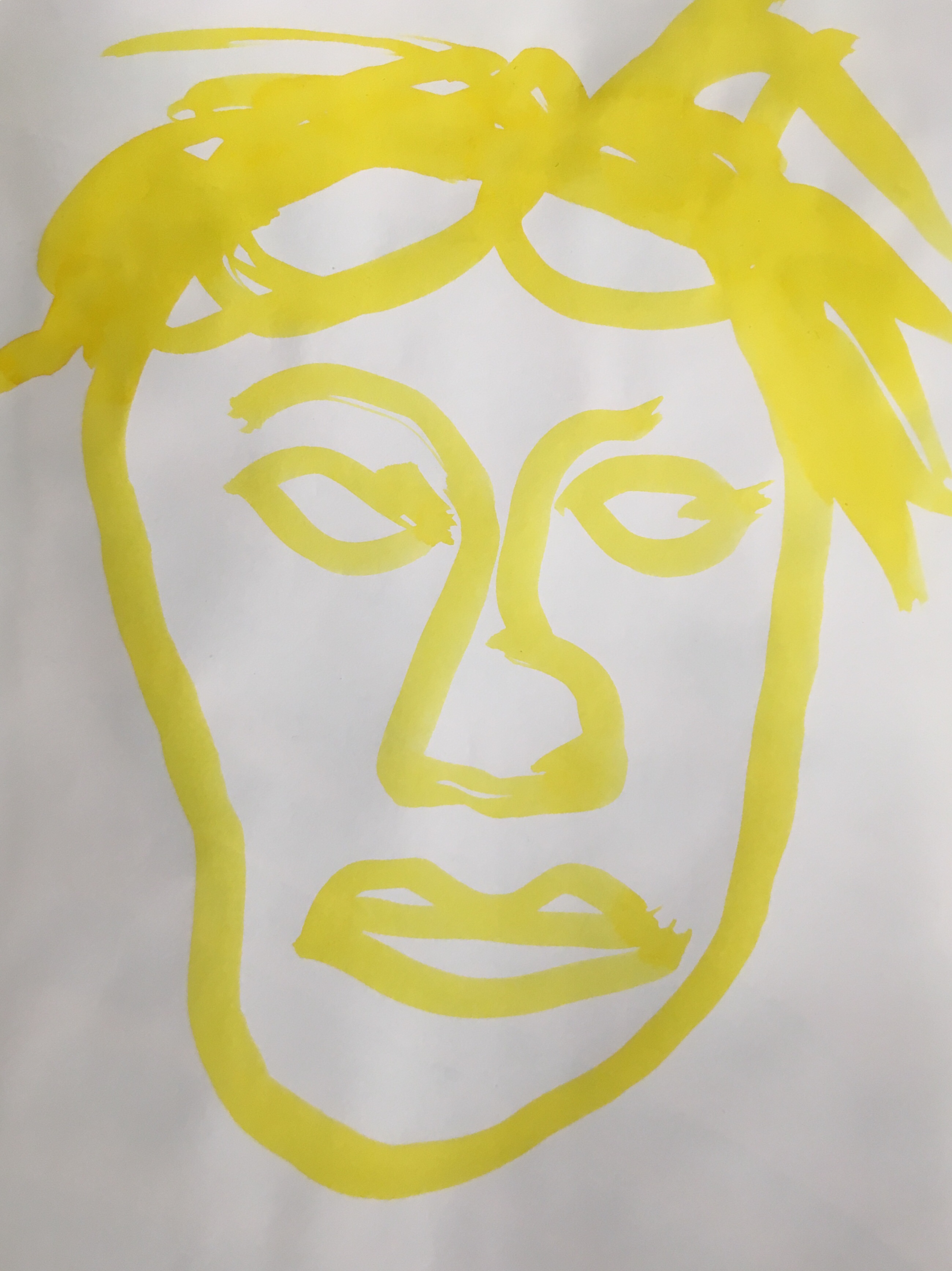 • fast slow selfie (The fast / slow progress is two drawings done one on top of the other. The first is done quickly in color with large strokes. The second is done in ink for an hour with lots of details.)